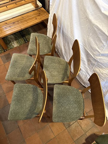 Dansk møbelproducent sæt af 5 spisestuestole i eg m. rygstykke i fineret teak samt sæde betrukket med stof. Fremstillet ca. 1950'erne.
