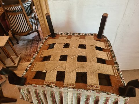 Par overpolstrede lænestole fra 1950'erne. Fremstår pæne og velholdte uden nævneværdige brugsspor.