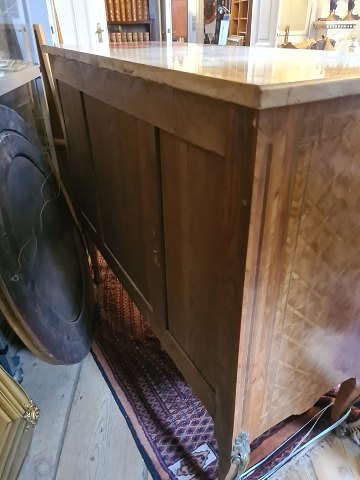 Kommode fra sidst i 1800 tallet. Fremstillet i rokokostil med låger og løstliggende marmorplade på toppen. Fremstår pæn og velholdt uden de store brugsspor.