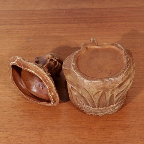 Lågkrukke i form af asiatisk figur i brændt lertøj med signatur i bunden.